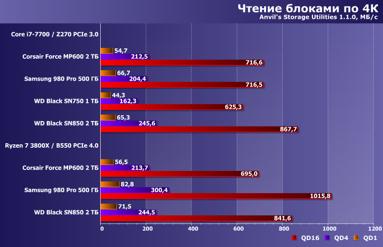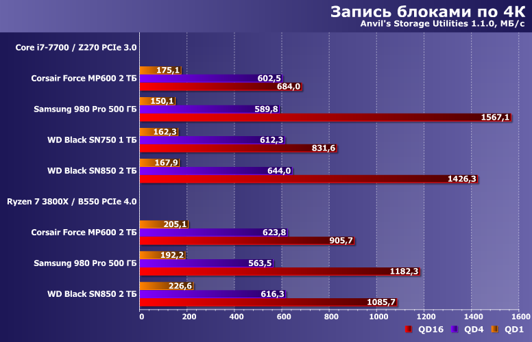 Последовательное чтение однозначно ограничивает невысокая емкость 980 Pro, но даже с учетом этого он все равно обходит любые SSD на Phison E16. Просто при увеличении емкости сможет поконкурировать и с WD Black SN850, а так, конечно, второй выглядит куда внушительнее. А вот в режиме PCIe 3.0 дальше двигаться было уже практически некуда. Только в однопоточном режиме — но он в новейших SSD по сравнению с разработками трехлетней давности как раз и ускорился.
