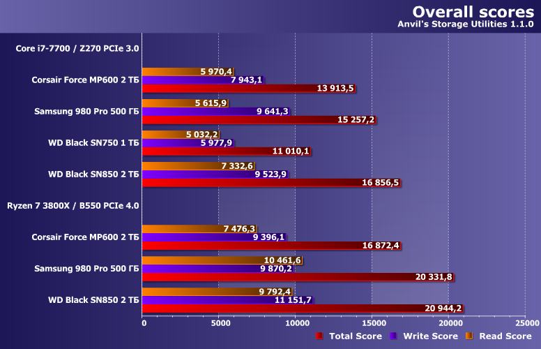 Аппаратного же опять будет немного больше. Поскольку основной отличительной особенностью WD Black SN850 является поддержка PCIe 4.0, нам потребуются две тестовых стенда: «стандартный» на Core i7-7700 и ASRock Z270 Killer SLI на чипсете Intel Z270 и «перспективный» на Ryzen 7 3800X и Gigabyte B550 Vision D на чипсете AMD B550, что нам обеспечивает поддержку нового интерфейса.