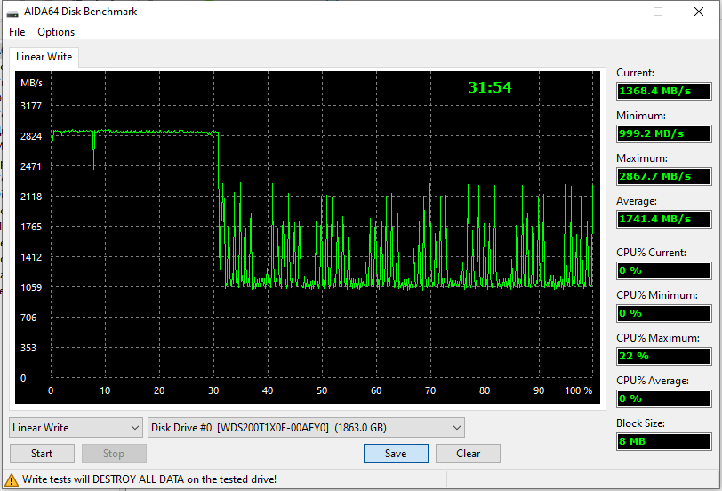 Второй момент: как и следовало ожидать, максимальные скорости достигаются только в пределах SLC-кэша — в данном случае его размер может достигать примерно трети свободной емкости, т. е. все свободные ячейки могут записываться в однобитном режиме. Эта политика кэширования радикально отличается от предыдущих моделей WD, где кэш был маленьким статическим, а основные силы были брошены на быструю запись непосредственно в TLC-массив. «Динамика» как правило последнюю скорость ограничивает — хотя и на неплохом уровне: ниже гигабайта в секунду не опускаемся, попутно пытаясь и освободить кэш от данных.