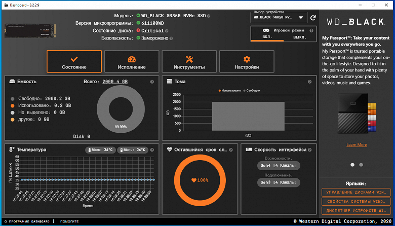 Остыв — ожил. Правда обнаружилась еще одна неприятная деталь: в SMART для NVMe-накопителей был добавлен специальный счетчик «Media and Data Integrity Errors», который уже, например, распознает фирменная утилита, и не только. Упомянутая аварийная ситуация его «размочила», так что теперь Dashboard уверен, что SSD находится в критическом состоянии, и требует замены. Что еще хуже, подобная функциональность реализована и в некоторых современных системных платах (например, на Z590), так что они тоже бьют тревогу, обнаружив ненулевое состояние «Media and Data Integrity Errors». Не первый уже месяц — за это время с накопителем проведена масса тестов, счетчик ресурса тоже давно снялся с отметки 100% (поскольку на данный момент записано уже более 30 ТБ, а гарантия разрешает 1200 ТБ, по-хорошему ему пора бы уже перейти на 98%, но пока держится 99%), но такая память об инциденте сохраняется и (иногда) немного мешает. Поэтому тут перед нами тот случай, когда без каких-нибудь радиаторов (а в идеале — лучше с принудительным обдувом) пытаться обходиться не стоит.