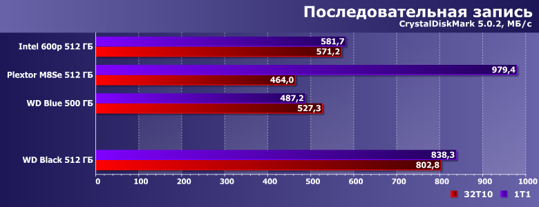 | Intel SSD 600p 512 ГБ | Plextor M8SeGN 512 ГБ | WD Blue 500 ГБ | WD Black 512 ГБ |