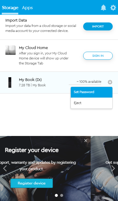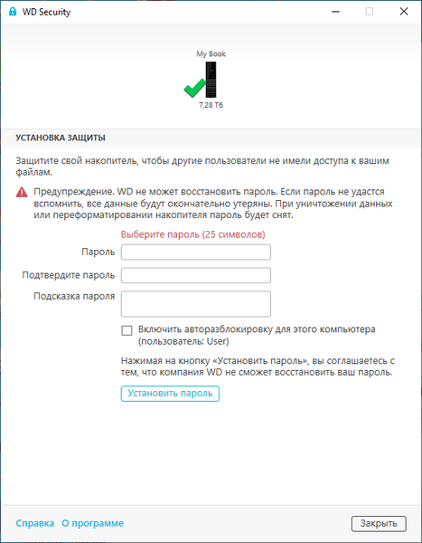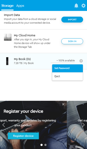 Но что касается самого My Book, то «основная» программа умеет работать только с парольной защитой или... отключать устройства. Все остальное — отдельные приложения. Которые нужно еще скачать и установить.