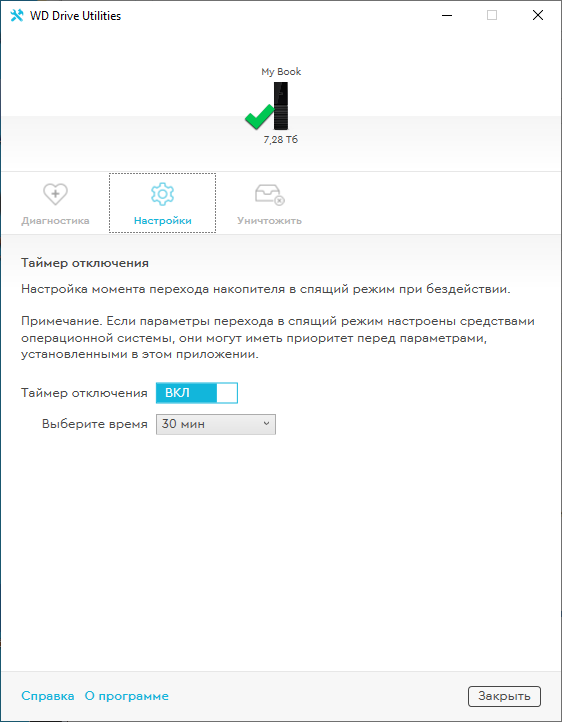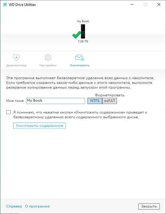 WD Drive Utility позволяет контролировать состояние накопителя, настраивать время его перехода в спящий режим или очищать жесткий диск с последующим форматированием в одну из двух файловых систем — NTFS или exFAT.