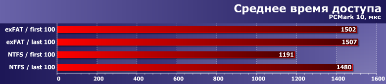 В общем, отдельный материал, посвященный PCMark 10 Storage, у нас будет. Вводить программу в рабочий цикл мы тоже будем — очень интересна в качестве комплексной оценки потребительских характеристик. Пока же стадия тестирования самого пакета — который мы применили и в этом случае. Для одной из любимых тем — сравнение файловых систем: exFAT и NTFS. Именно первая и используется по умолчанию, для хранения данных подходит отлично — а что с «рабочими» нагрузками? Понятно, что во многом это теория — поскольку установить Windows на exFAT, к примеру, на практике не получится, но... Причем отметим, что новая версия дискового теста в отличие от предыдущих для такого сравнения подходит — она работает с «реальными» файлами, а не дисковыми трассами, «загнанными» в один большой виртуальный файл.