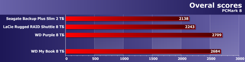 Методика подробно описана в отдельной статье. Там можно познакомиться с используемым программным обеспечением, а вот в качестве тестового стенда мы использовали NUC 7i7BNH, благо на нем уже протестировано несколько устройств. С ними мы и будем сравнивать нашего героя, упирая в первую очередь на качественные, а не количественные оценки. Абсолютные значения по понятным причинам могут в любой момент измениться — вместе с установленным внутрь жестким диском. Но мы все-таки сравним результаты с аналогичным по емкости «воздушным» WD Purple WD81PURZ. Правда, его мы тестировали на «стандартном» стенде — но на производительности винчестеров различия систем сказываются слабо или вообще не сказываются, так что такое сравнение по-своему интересно.
