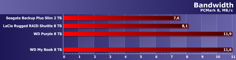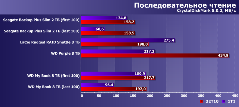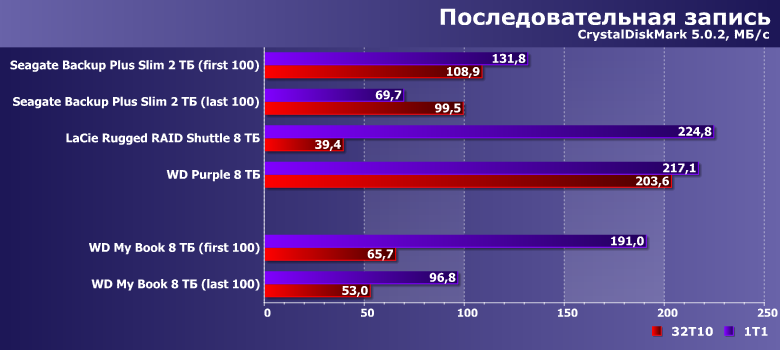 Но главное — внешние же Seagate Backup Plus Slim 2 ТБ и LaCie Rugged RAID Shuttle 8 ТБ. Первый — типичный портативный внешний жесткий диск со всеми своими особенностями. Второй — массив из пары подобных, на что пришлось идти ради увеличения скорости и емкости при сохранении USB-питания. Вот и сравним такой сложный (и дорогой!) путь с простым «лобовым» — десктопным винчестером на те же 8 ТБ.