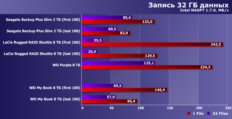 Включая и то, что в более-менее сложных случаях скорость начинает зависеть от RAID-контроллера, так что Rugged RAID Shuttle оказался самым медленным в многопоточном режиме, хоть и лидирует в чисто последовательном. К нашему герою, вообще говоря, есть некоторые замечания в плане несимметричности чтения и записи — и некоторого отставания от внутреннего Purple. Вообще картина напоминает ранние модели с SMR, хотя в «восьмерках» WD ранее эта технология замечена не была (вот «начинка» My Book на 4 и 6 ТБ точно «черепичная»). Впрочем, сравнению с портативными ВЖД это все равно не слишком мешает — они-то давно уже поголовно SMR. А окончательные выводы отложим до файловых операций.
