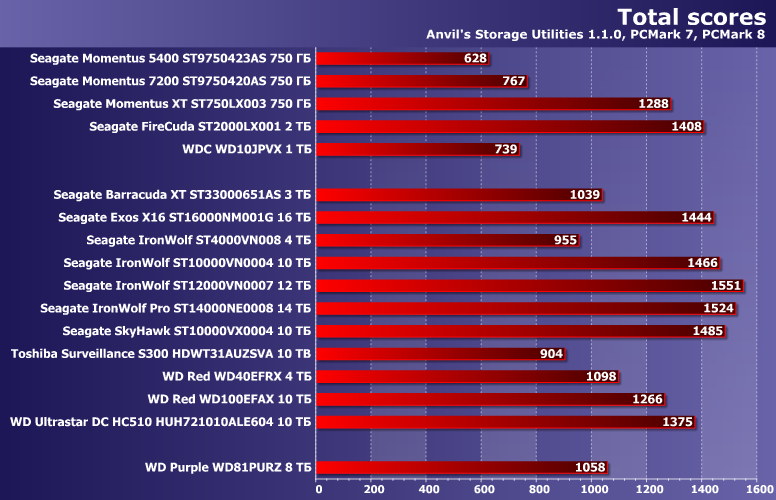 Как уже не раз было сказано, «системные» нагрузки несколько синтетичны для винчестеров высокой емкости: их покупатели могут себе позволить и SSD «приличного размера», куда поместятся и программы, и основные рабочие данные. С другой стороны, некоторые сценарии, моделируемые в PCMark, все равно применимы и к «дополнительному» накопителю: например, база фотографий или, тем более, медиатека с большой вероятностью будет храниться именно на винчестере при его наличии — некоторые именно для этих целей как раз и приобретают те же «десятки» и устанавливают их именно в ПК, а не в NAS. Кроме того, других «тяжелых» и комплексных нагрузок на типовом ПК обычно и вовсе не бывает, а низкоуровневые тесты работают с принципиально синтетическими — поэтому игнорировать данные тестовые пакеты не стоит.
