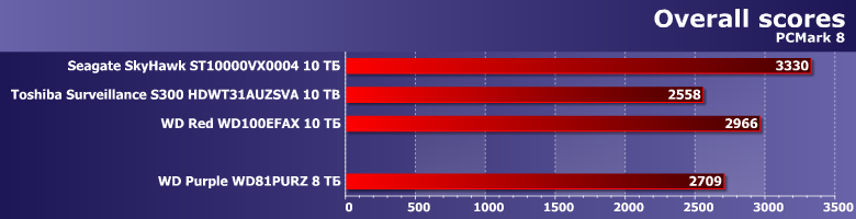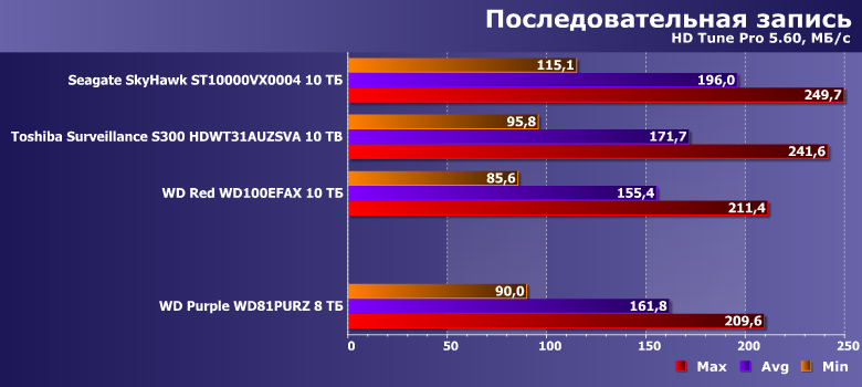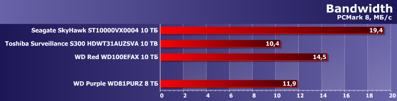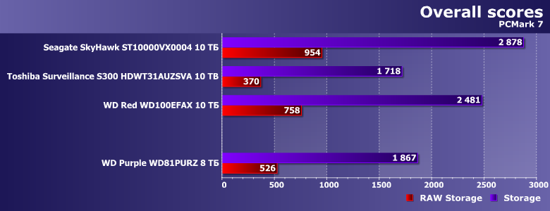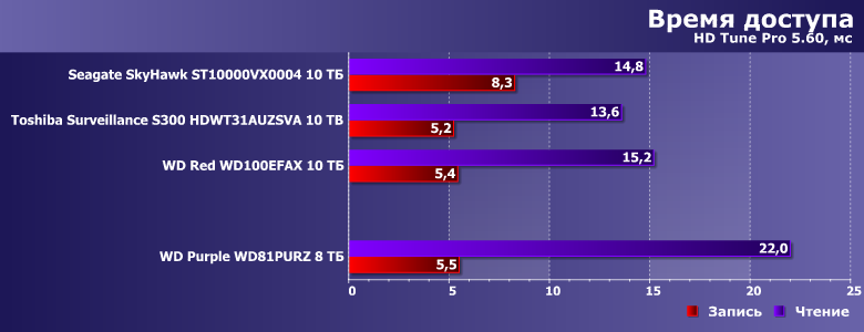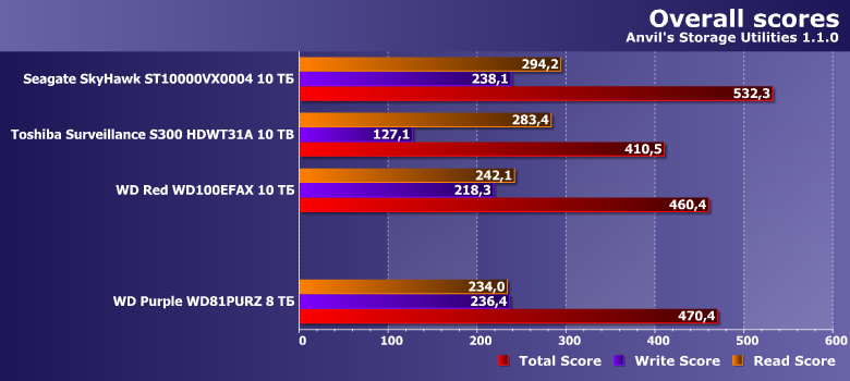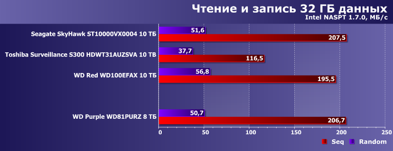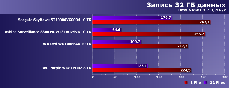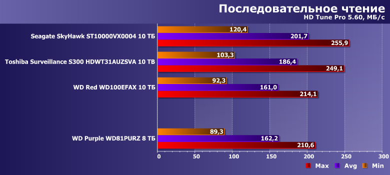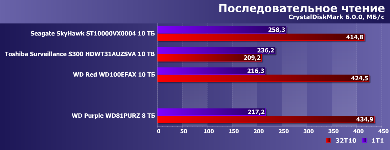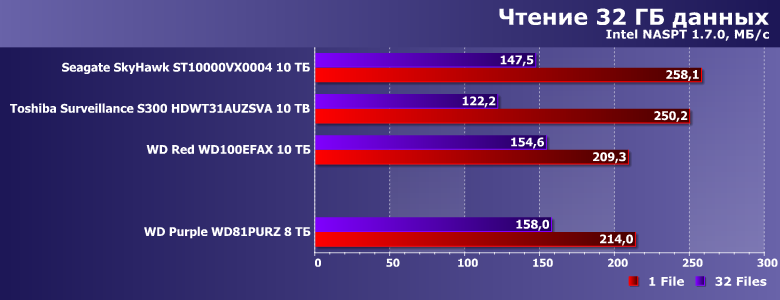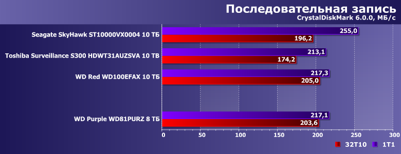 В этой связи в качестве одного из ориентиров для сравнения был взят WD Red WD100EFAX, благо основан он на аналогичной (пусть и не такой же в точности) платформе и, главное, имеет ту же скорость вращения пластин. Продукты же Seagate и Toshiba имеют то же целевое назначение. SkyHawk должен работать быстрее, поскольку тут «всего больше». Прямое же сравнение Purple с Toshiba Surveillance S300 не столь однозначно — последний тоже «воздушный», но для своих ТТХ не слишком быстрый (в чем мы уже убедились). Вот и посмотрим — что скажется сильнее.