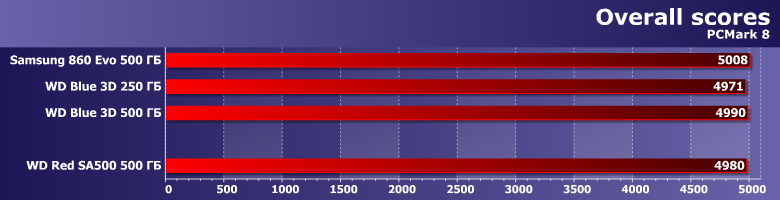 Но никаких неожиданностей произойти не могло. Как и следовало ожидать, производительность Red SA500 на 500 ГБ оказывается между WD Blue 3D на 250 и те же 500 ГБ. И вообще — в этом классе и в этих сценариях все накопители давно равны как на подбор. Поэтому выбирать приходится по другим критериям. Хотя это как раз в какой-то степени на руку именно Red — спокойнее с ним при таких условиях гарантии. Не то, чтоб Blue «не хватало» — а просто спокойнее.