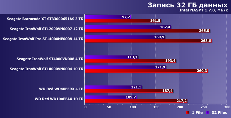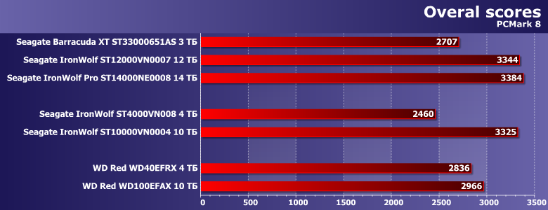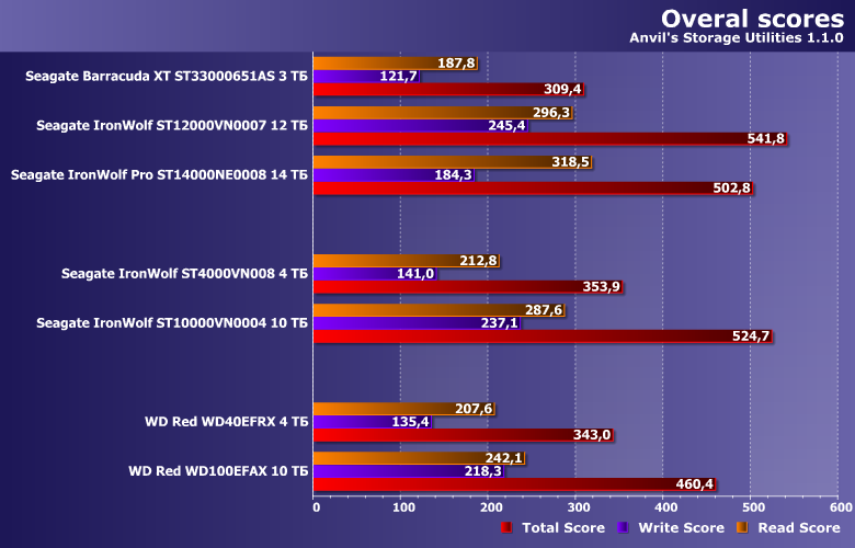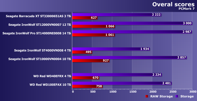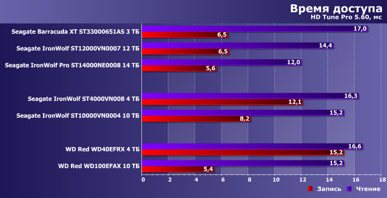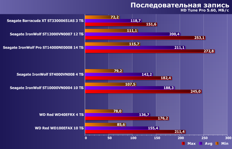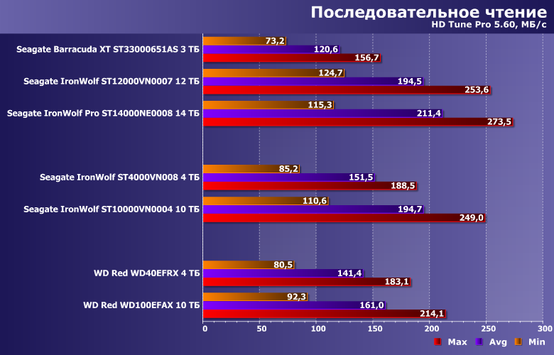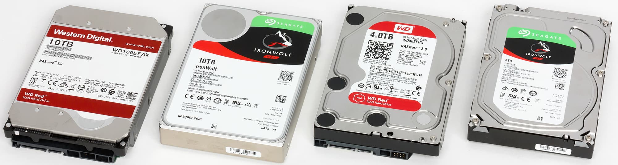 | Seagate Barraсuda XT ST33000651AS | Seagate IronWolf ST4000VN008 | Seagate IronWolf ST10000VN0004 | Seagate IronWolf ST12000VN0007 | Seagate IronWolf Pro ST14000NE0008 | WD Red WD40EFRX 4 ТБ | WD Red WD100EFAX 10 ТБ | |