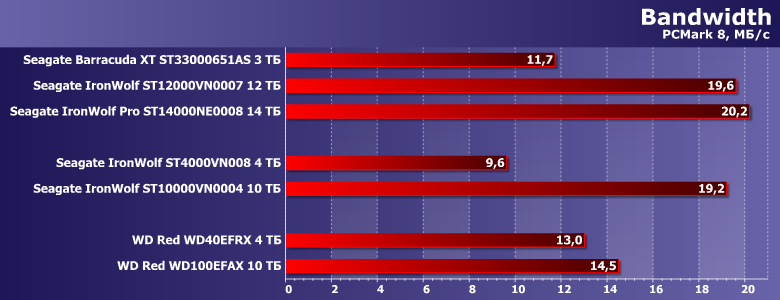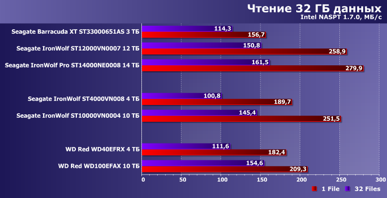 Отметим, что при последовательном чтении данных в один поток IronWolf на 4 ТБ все-таки обогнал аналогичный Red — вопреки результатам низкоуровневых бенчмарков, но в меньшей степени, чем можно было бы ожидать на основании ТТХ. С большими же емкостями все куда прозаичнее: Seagate в этом сегменте старается если уж не наращивать скорость вращения, то, хотя бы, не снижать ее в большинстве линеек. У WD же 7200 об/мин давно уже опция для самых-самых (как когда-то было 10К в Raptor).