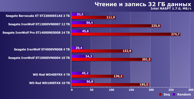 Что самое интересное, и на последовательных операциях IronWolf не быстрее Red, хотя с точки зрения низкоуровневых характеристик так быть не должно. Разумеется, если говорить о 4 ТБ — десятки-то работают существенно по-разному. Что тоже противоречит заявлениям Seagate, хотя и это не новость: компания декларирует 210 МБ/с для «обычных» IronWolf, но для идентичных аппаратно IronWolf Pro заявлены как раз вполне реальные 250 МБ/с.