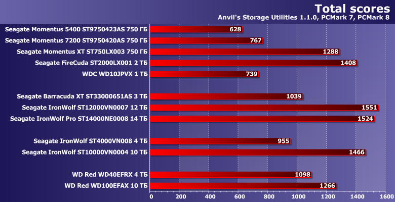 Почему именно их? Как уже было сказано выше, «четверки» очень интересны и в плане невысокой относительной цены хранения данных, и из-за того, что абсолютная цена винчестера остается невысокой. А вот емкость — уже достаточна для многих сфер применения. Особенно в многодисковом NAS, где суммарная емкость массива и при использовании таких моделей нередко начинает превышать десяток терабайт. Причем каких-то три-четыре пластины — как раз простая и надежная конструкция. Да и дешевая. Но не обязательно быстрая. Особенно в случае WD Red с четырьмя пластинами по 1 ТБ и скоростью вращения 5400 об/мин. IronWolf в теории должен быть более быстрым — ведь в нем пластины три (т. е. каждая более плотная), да и вращаются они на скорости 5900 об/мин. В первом приближении так. Во-втором — не обязательно полученный некогда жизненный опыт будет соответствовать современным реалиям. Что и делает непосредственное сравнение этих двух моделей очень интересным.