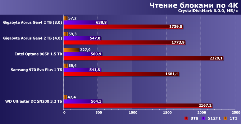 Чтение в один поток выполняется быстро, но не более того — а вот если сымитировать «большую» нагрузку, так сразу становится понятно: зачем нужен PCIe 3.0 x8. Впрочем, формально сейчас можно обойтись и четырьмя линиями, но PCIe 4.0 — однако на деле Aorus Gen4 SSD намного медленнее (при той же теоретической пропускной способности интерфейса). При этом серверных (да и каких-либо еще) платформ с поддержкой PCIe 4.0 почитай и сейчас нет — зато 3.0 х8 найти можно много где. Откуда и выбор интерфейса подключения.