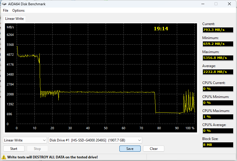 Графики в общих чертах похожи, но их не спутаешь. Во-первых, SLC-кэш имеет разный размер — в YMTC под него выделено больше места. Во-вторых, изучаемый SSD и в кэш данные записывает быстрее: HikVision G4000 — тот за 5 ГБ/с выбирается лишь в совсем маленькой статической части SLC-кэша, а PC411 такую скорость держит почти до 20% свободного места. Но к финишу он всё равно приходит позже: больше кэш — больше и штраф за его уплотнение в конце; меньше кэш — больше участок прямой записи на скорости чуть более 2 ГБ/с. И это зачастую важнее. Например, если требуется «рабочее тело» для быстрого внешнего SSD, то лучше в качестве него взять G4000.