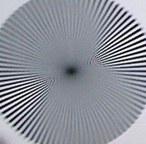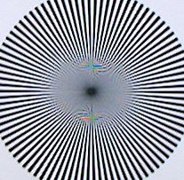 Как видно из приведенных снимков мир, объектив обладает существенным астигматизмом, ЧКХ от центра к краю также меняется существенно, ну и, наконец, объектив перекошен относительно матрицы, поскольку правый край существенно отличается от левого. Для того, чтобы снять подозрения, что снимки сделаны не с точки, лежащей на перпендикуляре к центру миры, делалось два снимка с одной точки: аппаратом, расположенным нормальным образом, и перевернутым вверх ногами. В этом случае, если бы проблема была не в юстировке, то мы имели бы нерезкими разные края кадра. Для сравнения приведены снимки миры, сделанные 4 Мп камерой Casio QV 4000.