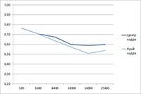 Если же перевести качество картинки в цифры (пока лучший измеритель для этого — радиальные миры; лучший, но далеко не идеальный), мы получим почти знакомые зависимости. «Почти» — потому что каждая камера дает свои показатели, но при этом характер кривых можно предсказать: разрешение RAW будет выше того, что дает JPG, примерно на 0,1 линии на пиксель.