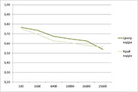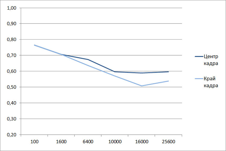 И, наконец, на длинном фокусе умеренная «подушка» становится совсем умеренной: по вертикали D = 1,63, по горизонтали D = 0,85. Разрешение и центре кадра, и на краю чуть падает, но редко опускается ниже 0,65 линии на пиксель. А «хроматика», напротив, растет, но все равно остается на уровне «практически незаметной», менее 3 процентов.