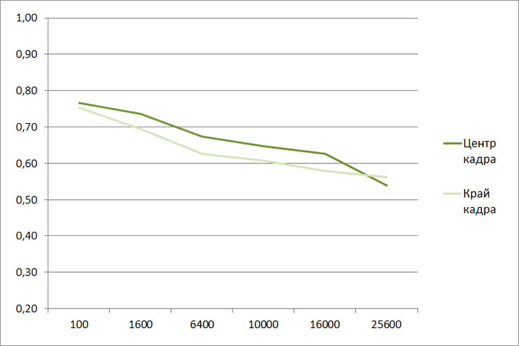 Кроме того, можно ожидать, что «мягкая» картинка Canon даст разрешение чуть ниже, чем «жесткая» от Nikon. Да, все это видно на графиках. Немного неожиданные результат получился у JPG с фильтром шумов. Обычно фильтр ослабляет разрешение JPG еще на 0,05 линии, но в случае Canon EOS 6D мы этого не наблюдаем. Кривые с выключенным и включенным фильтром идут примерно на одном уровне. Пожалуй, в этом проявляются преимущества «мягкой» картинки.