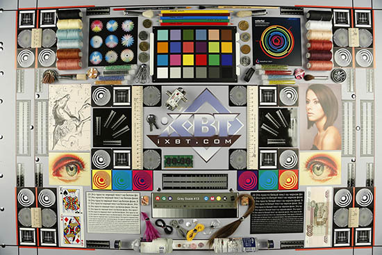 | Снимки тестового стенда: слева Canon EOS 6D, справа Nikon D750. Проявка RAW с установками по умолчанию, изменена только температура проявки — в обоих случаях это 3200 по Кельвину. |