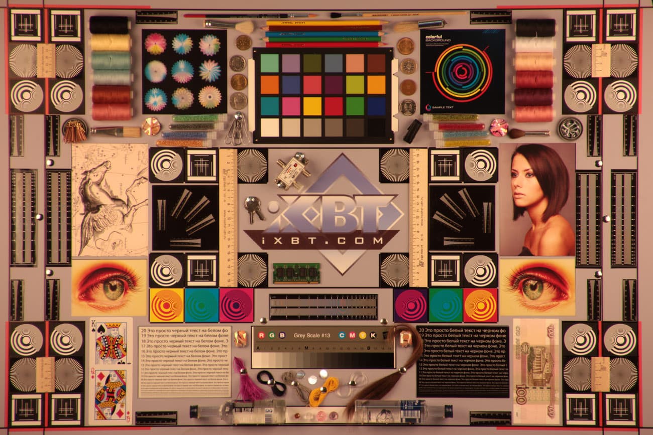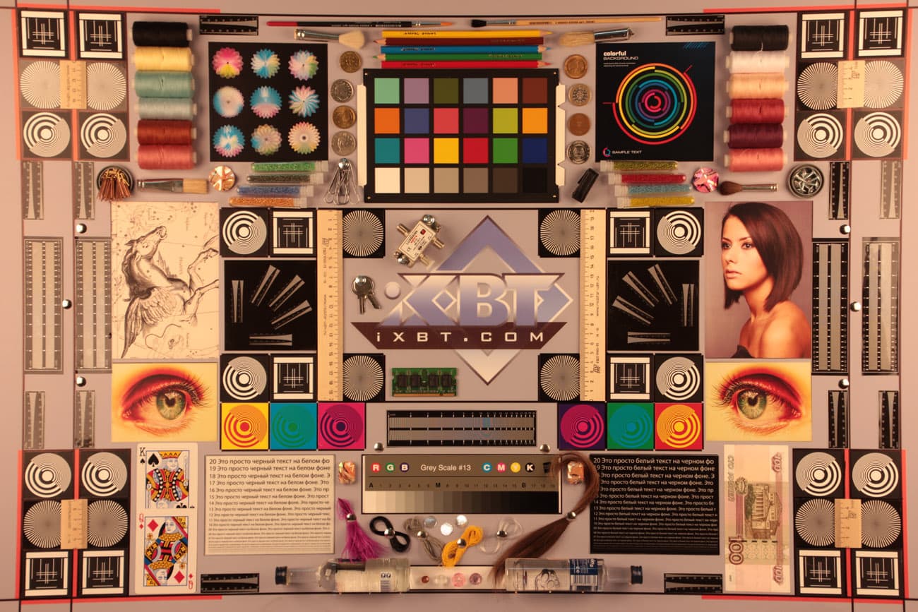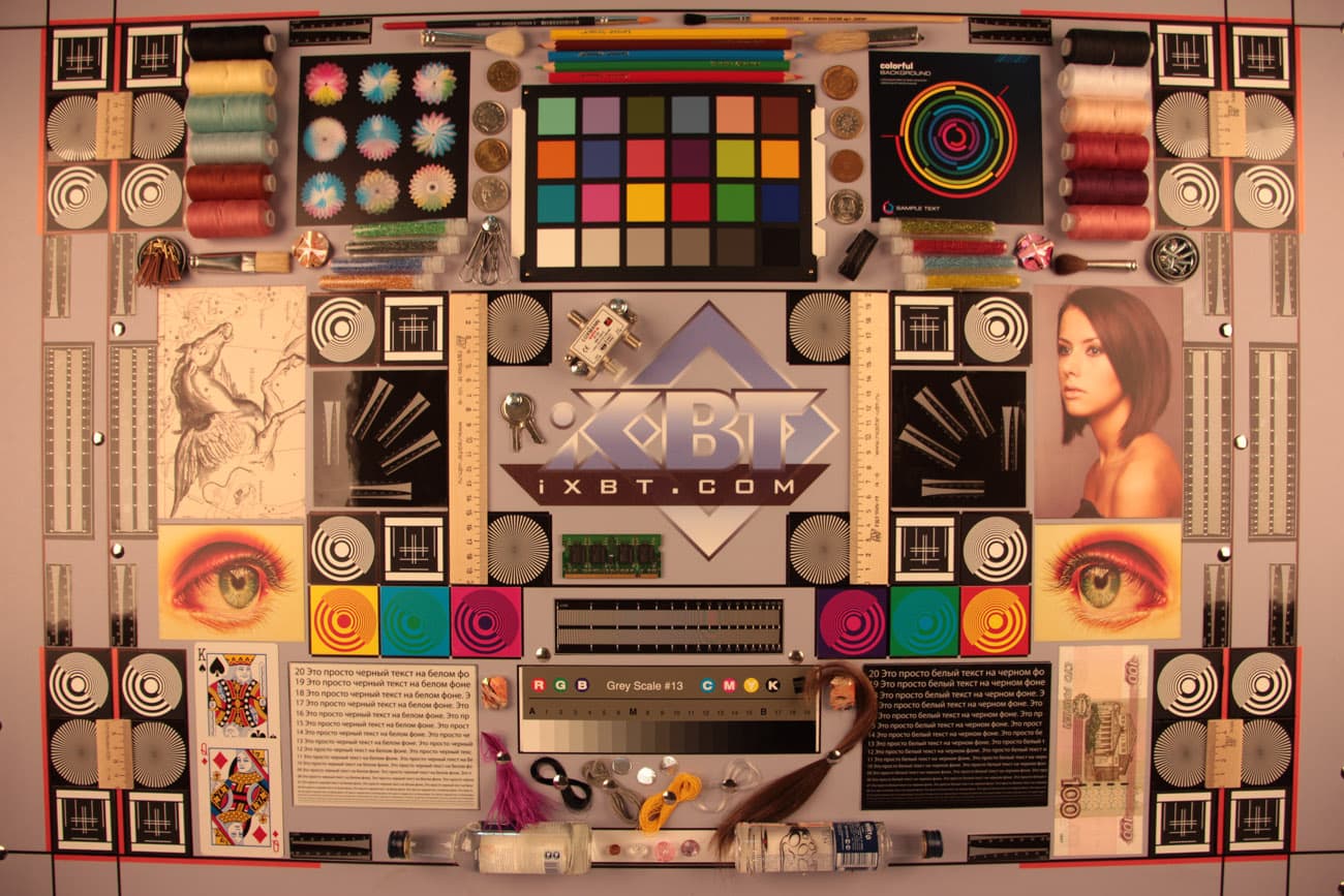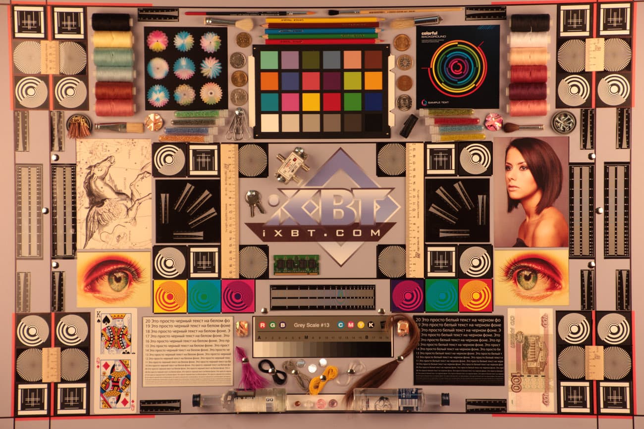 Во второй таблице даны тестовые снимки мишени, которая хорошо показывает, насколько велики геометрические и хроматические аберрации. Здесь видно, что в центре кадра (в первом ряду) геометрические искажения практически незаметны, а «хроматика» находится на уровне меньше 1 процента, т. е. почти не видна.