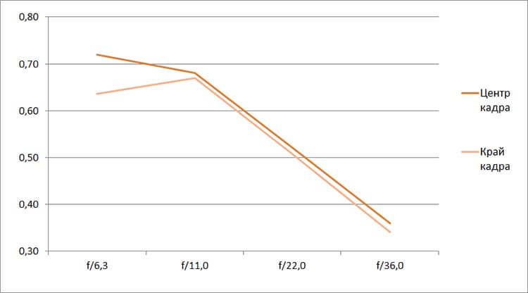 Разрешение на этом фокусном расстоянии остается довольно высоким, отчасти потому, что минимальная диафрагма относительно большая — f/22. И в центре, и на краю кадра разрешение укладывается в диапазон 0,5—0,7 линий на пиксель. Не блестящий, но вполне приемлемый результат.