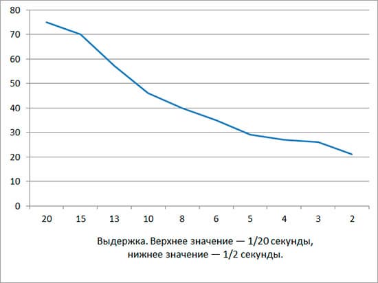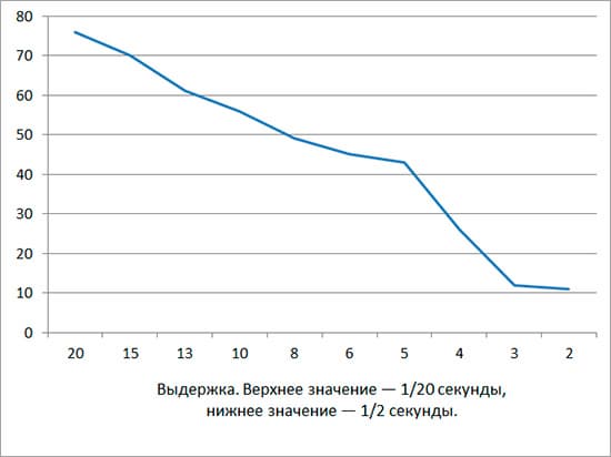 Перед подведением итогов посмотрим, насколько хорошо работает стабилизатор Tamron 16-300mm. Здесь мы наблюдаем типичную картину «двухступенчатый стабилизатор» — который способен подарить фотографу 2 ступени EV. Вероятность, что кадр получится резким, опускается ниже 0,7 при выдержке 1/15 секунды.