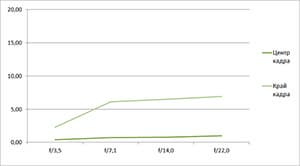Разрешение в диапазоне f/5.0—f/22 остается в рамках 0,5—0,7 линий на пиксель. А при уменьшении диафрагмы до f/32 закономерно снижается до 0,4. Граждане! Не используйте диафрагму у́же f/22! Уровень хроматических аберраций на этом фокусном расстоянии падает — даже на краю кадра «хроматика» не превышает 4 процентов.