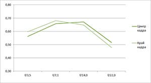 Разрешение на коротком фокусном расстоянии довольно высокое в центре кадра, но на минимально раскрытой диафрагме снижается до 0,45 линий на пиксель. Разрешение на краю кадра заметно ниже разрешения в центре — начинается от 0,5, поднимается до 0,7 и на минимальной диафрагме падает до 0,4 линий на пиксель.