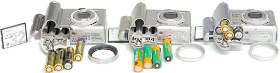 Все камеры питаются от 4 АА элементов, имеют однотипный байонет под переходник на внешние насадки на объектив. Используется CF I для хранения снимков. Штативное гнездо пластик, что не большая проблема при легкости камеры.