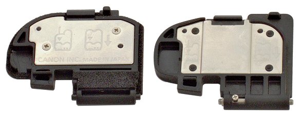 Слева Canon D60, справа Canon 5D. Обращаю внимание на места, помеченные стрелками. У 5D отсутствует механический выключатель электрической системы сопряжения с объективом.