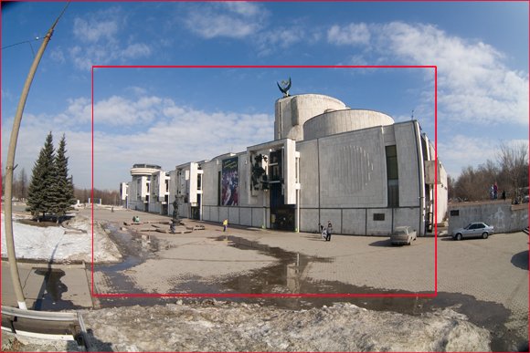 Как это сделано. Взят снимок, сделанный объективом Пеленг, и на него наложены снимки, сделанные другими объективами, уменьшены до совпадения масштаба и обведены рамкой. Именно эти рамки и приведены на фото, а само изображение оставлено то, которое получено объективом Пеленг, поэтому сохранились и присущие ему искажения. Красная рамка ограничивает изображение, попавшее в кадр камеры Canon 5D, зеленая — D60. Цифрами обозначены следующие объективы: