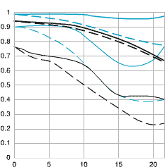 - черный цвет линий — для случая максимально открытой диафрагмы (у данного объектива f/3,5);