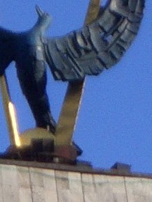 F=13,5 мм; 1:6,6; 1/250 с; EV=0; ISO-50; дистанция — 13884 мм. В режиме автоматической фокусировки, как бы далеко не был расположен объект, камера обычно фокусируется на дистанцию, хоть и превышающую гиперфокальное расстояние, необходимое для получения максимальной глубины резкости, но существенно более близкую, чем реальное расстояние до объекта. Воспользовавшись программой из статьи, и считая размер допустимого круга нерезкости равным 5 мкм (2 пикселя), получим для гиперфокального расстояния — 6 м. Впрочем, возможно, что шаг перемещения объектива просто больше, чем разница между фокусировкой на 13 м и бесконечностью. | |