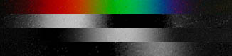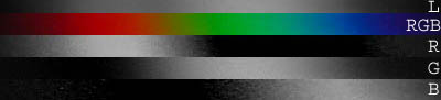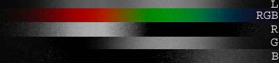Фрагменты спектров. Верхний соответствует ручной настройке баланса белого, нижний — автоматической. Приведены «полоски», соответствующие каналу L (яркость) из Lab Photoshop, RGB и каналов R G B в отдельности. Хорошо заметно, что при автоматической настройке баланса белого и использовании лампы накаливания в качестве источника света в синем канале информация почти не регистрируется. Видимые цвета RGB — такие же фильтры установлены перед чувствительной матрицей. В канале L хорошо заметно падение чувствительности на переходе красный-зеленый.