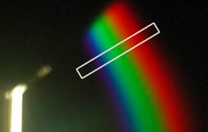 Собрав установку приблизительно и наведя изображение щели на CD, гасим свет. В темной комнате легко найти радужные разводы на стенах и установить все элементы установки так, чтобы спектр оказался на экране и его можно было снять. После этого нужно подстроить фокусировку и снимать. Все цветные полосы спектра должны быть хорошо видны. Так как в качестве источника света используется лампа накаливания, то до съемки нужно вручную настроить баланс белого цифровой камеры по экрану, освещенному проектором.