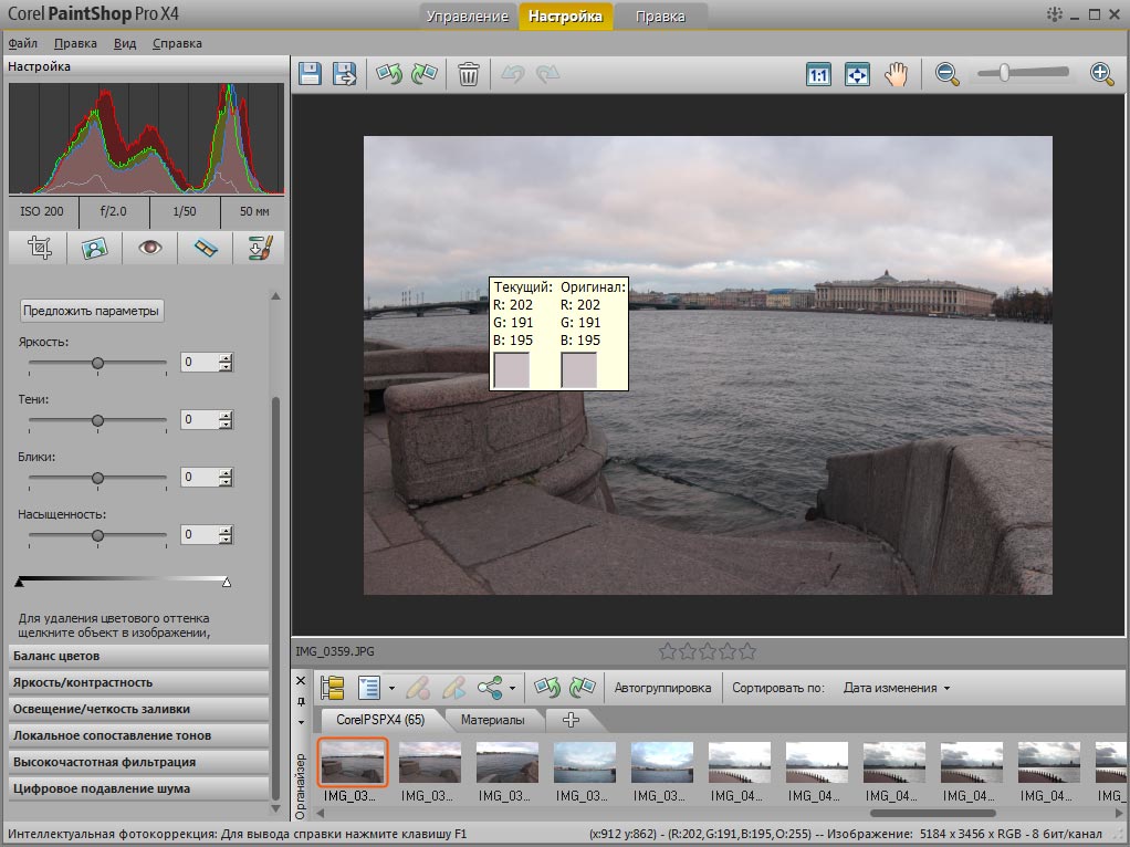 Окно «Настройка» позволяет настраивать изображение «в общем», без локальной ретуши. Просто следуя по порядку вкладок панели инструментов (левая вертикальная панель под окном гистограммы), можно «довести» фотографию до требуемого уровня. На самом деле, встроенные автоматические и полуавтоматические функции в модуле «Настройка» выполнят даже часть операций локальной ретуши, но без кропотливой ручной работы. К ним относятся инструменты, представленные пиктограммами в панели настроек: «Красные глаза», «Стройность» и «Косметика» (ретушь морщин, отбеливание зубов и белков глаз, загар), а также клонирование.