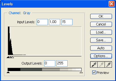 И перед нами на экране возникает черный прямоугольник. Открываем меню Уровни и видим, что все изображение использует 15/256 от 65 тысяч оттенков. Это тоже немаленькая величина, 3855, то есть почти два в 12 степени.