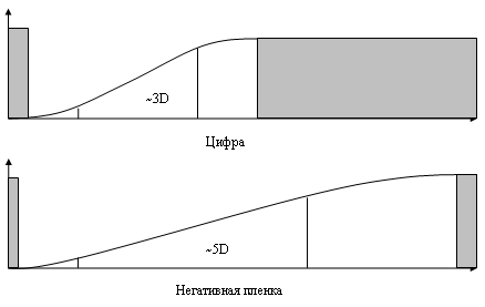 Серым цветом обозначены зоны не регистрируемых деталей (пересвет и абсолютно черный цвет). Вертикальными линиями выделена зона линейной характеристики, по которой традиционно измеряется динамический диапазон. Но, кроме нее следует обратить внимание и на нелинейные зоны — в тенях (слева) и светах (справа). Именно здесь пленка получает свою неповторимую пластику и преимущество — и парадокс в том, что именно эти участки (наиболее темные и светлые объекты) интересны глазу при рассматривании изображений. Данный эффект пленки особенно важен при съемке портретов, т. к. пересвеченные области на лице неприятны, а портреты при естественном освещении зачастую содержат очень широкий перепад яркостей — от теней одежды и темной радужной оболочки глаза до светлой кожи.
