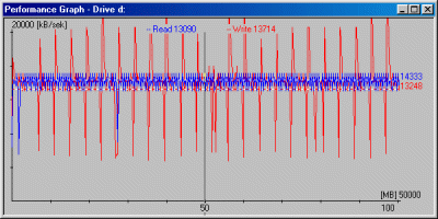 На этом графике приведены результаты для диска Quantum CR 8.4 на материнской плате ASUS P2B под Windows-98. Синий график — чтение файла. Красный — запись. Резкие выбросы при записи обьясняются частым обращением головок к началу дискового раздела для модификации цепочки кластеров в таблице FAT. Справа показаны усредненные характеристики при записи и чтении.