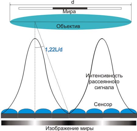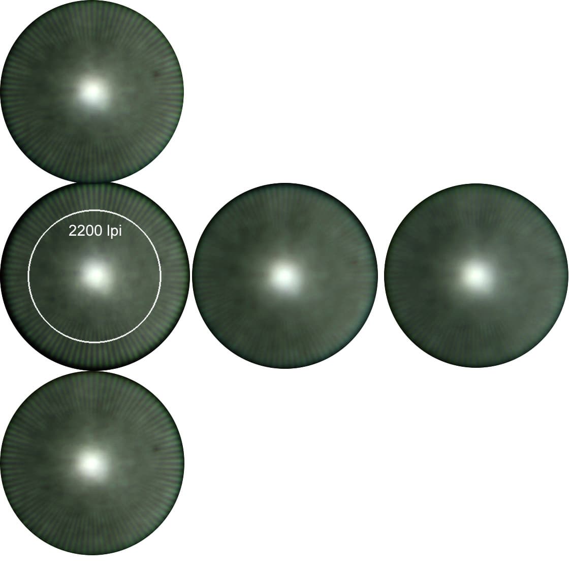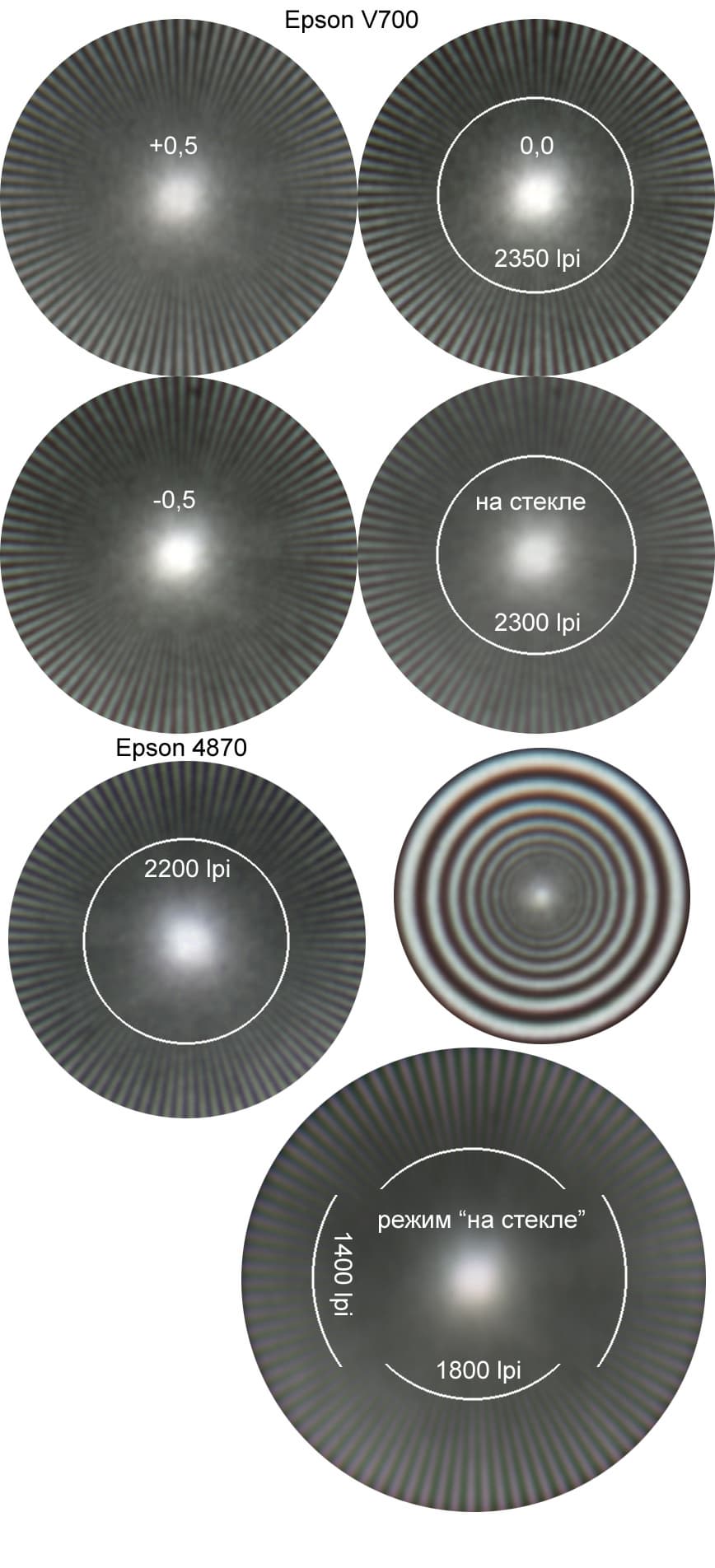 Прежде чем описывать реальные результаты измерений, полезно оценить возможности оптики. Из пресс-релиза Epson можно узнать, что апертура объектива f/6,2, а коэффициент увеличения для пленки в рамке и пленки на стекле 0,34Х и 0,26Х (Super Resolution Lens и High Resolution Lens соответственно). Дифракционное рассеяние (угловое) в плоскости сканирующей линейки для объектива приблизительно равно отношению длины волны (L) к апертуре (d) (с коэффициентом 1,22 для углового радиуса). Для перевода этой величины в линейный размер ее нужно умножить на расстояние от объектива до сканирующей линейки. При увеличении 0,34 эта величина равна 1,34*f (что не трудно получить из простых законов геометрической оптики). Таким образом, радиус пятна рассеяния будет приблизительно 1,22*1,34*L*f/d. Что для длины волны 0,6 микрона и апертуры f/6,2 дает величину рассеяния (диаметр кружка рассеяния) в 12 микрон. Размер каждой ячейки сенсора можно вычислить, зная увеличение 0,34 и число элементов отдельной линейки на дюйм «пленки» — 3200 dpi, получим 2,7 микрона. Таким образом, реальное разрешение при условии необходимости достижения высокого контраста, будет существенно меньше предполагаемого 3200 ppi (приблизительно вдвое меньше при условии сохранения контраста между центрами черного и белого штрихов миры).
