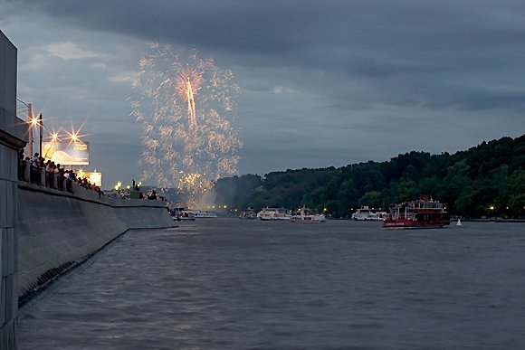 В детстве я всегда ходил на салют на Ходынку. Смотреть фейерверк, слушать салют и, если удастся, посмотреть на пушки. Это я к тому, что снимаем мы всегда фейерверк — салют, если он в Москве еще и проводится, можно только слушать. Праздничные фейерверки устраивали синхронными залпами по всей Москве. Между залпами интервал, кажется, был секунд тридцать, и эффекты одного залпа никогда не накладывались на другой. При съемке на пленку основная проблема была угадать экспозицию, в особенности, когда надо было снять салют на фоне чего-то, и на диапозитивную пленку, которая не позволяла ничего подправить потом. Сегодня при съемке на цифровые камеры проблема экспозиции практически не актуальна. Глядя на ЖК экран, можно внести коррекции еще до того, как закончится фейерверк. Поэтому основной интерес сегодня представляют следующие вопросы: с какой выдержкой снимать и в каком масштабе. В этой заметке я приведу ряд примеров с комментариями, а выводы, что хорошо и что плохо для вас, вы будете делать уже сами. Практическая польза от этих примеров в том, что фейерверк длится все-таки не очень долго, некоторые дефекты изображения трудно отследить на маленьком экране камеры. Яркость неба короткими летними ночами очень быстро меняется. В этой заметке собраны фотографии, сделанные в новогоднюю ночь, во время фейерверка 9 мая и на фестивале фейерверков 1 июня 2007 г. Фестиваль фейерверков