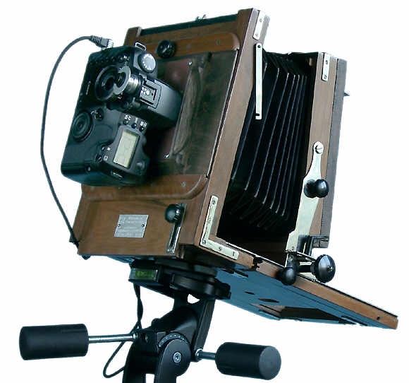 Простейший способ сделать из ФКД цифровую камеру заключается в замене кассеты для пластинок на матрицу. Для этих целей можно воспользоваться, например, задником, выпускаемым фирмами Kodak, Sinar и т.д. Собственно говоря, такие задники и предназначены для превращения выдвижных павильонных камер в цифровые. Но поскольку эти задники весьма дороги, то я попытался найти более дешевый и доступный способ. Таким способом, на мой взгляд, является использование вместо цифрового задника зеркальной цифровой камеры со сменной оптикой. Для этого вначале была взята камера Canon EOS D30 и закреплена внутри разобранной кассеты для фотопластинок таким образом, чтобы плоскость матрицы совпадала с плоскостью пластинки. Переделка очень простая, но обладает рядом существенных недостатков.