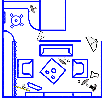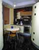 Основной свет вспышек был поделен между комнатой и кухней. Справа, поблизости от камеры находилась заполняющая вспышка The BAREBulb-Tristar Photo, своей полусферой направленная вверх, в потолок. Далее, метрах в 2-х располагался еще один софтбокс с мощной вспышкой. На кухню был направлен другой софтбокс, спрятанный за стенкой в проходе, а также вспышка через зонт, находящаяся справа на столешнице, на том же месте, что и в случае съемки отдельно кухни. В противоположном от камеры углу за телевизором находилась еще одна вспышка в паре с «золотым» отражателем. После тестовой цифровой съемки в кадр было помещено еще две вспышки с зонтами. Первая подсвечивала пространство под столом со стороны дивана, а вторая — поверхность ближайшего к фотокамере кресла.