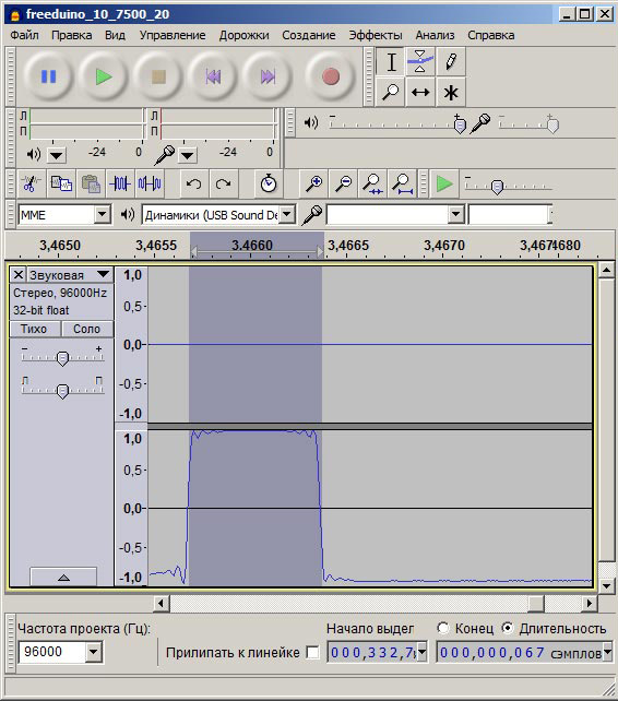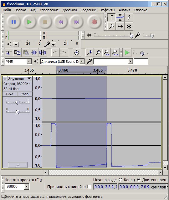Чтобы разобраться, в чем причина неудачи, воспользуемся описанной в статье «Универсальный ИК-пульт для камеры Canon. Часть первая: приемник для дешифровки ИК-сигнала» установкой для регистрации ИК-сигнала. Вот что покажет Audacity: