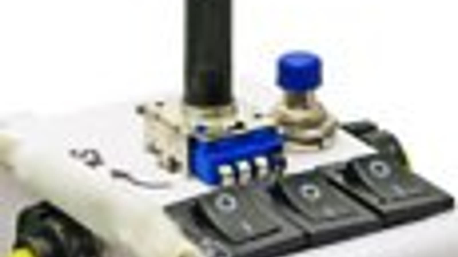 В пульте я использовал 1 потенциометр и 6 кнопок и переключателей. Три переключателя будут дискретно задавать время задержки между снимками. Потенциометр выполняет псевдоаналоговую (дискретную с большим количеством шагов) регулировку. Две кнопки с фиксацией будут управлять включением программы-таймера и режимом работы пульта (с задержкой и без). Одна кнопка без фиксации (синяя на картинке) дублирует кнопку «сброс» контроллера. Количество кнопок было выбрано исходя из возможностей понравившегося мне телефонного разветвителя — у него 8 выводов, что достаточно для «земли» и 7 сигнальных линий. Схема подключения элементов проста — кнопки и потенциометр собраны вместе и подключены к общей земле и +5 В в соответствии с указанными выше схемами их индивидуального подключения. Фотография конструкции приведена далее: