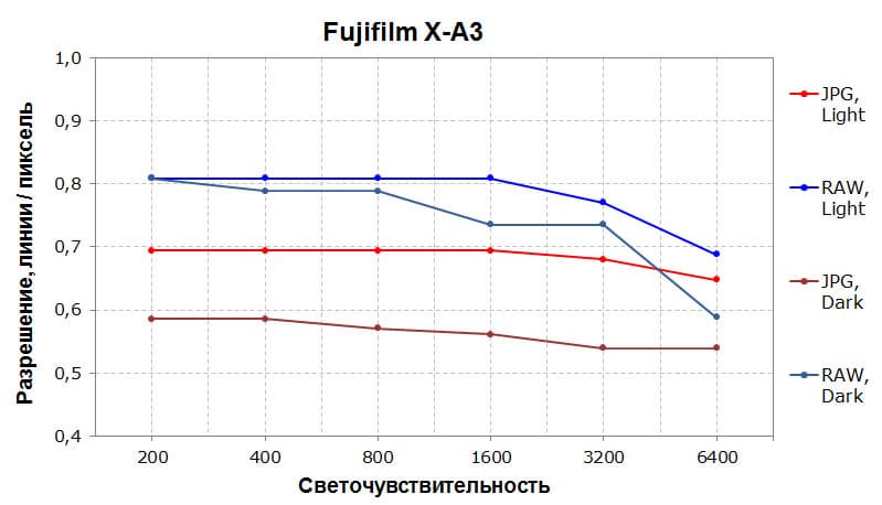 Кривая разрешающей способности отражает высокие показатели работы нашей подопечной. В случае с RAW максимальное значение составляет 80%, а это весьма неплохой результат. Заметим, что разрешение почти не падает вплоть до ISO 1600, а далее снижается довольно плавно до ISO 6400. RAW в темной сцене демонстрируют кривые не хуже. А вот с JPEG ситуация иная: в светлой сцене камере не удается догнать RAW даже на минимальной светочувствительности, но относительное падение разрешения гораздо меньше и остается почти на уровне 70% даже на ISO 6400. Темная сцена «проваливается» еще на 10% — здесь назвать разрешение высоким уже нельзя. Вывод: при недостатке освещения следует стараться снимать в RAW (впрочем, такой подход оправдывает себя в любой ситуации).