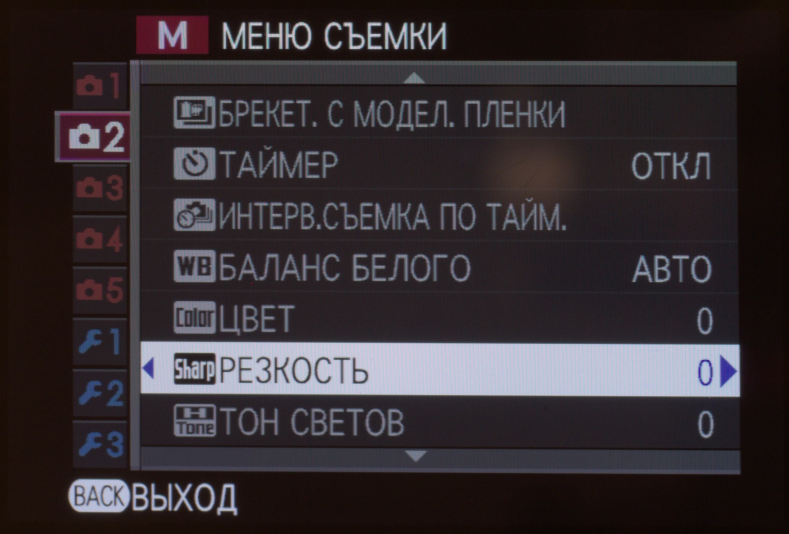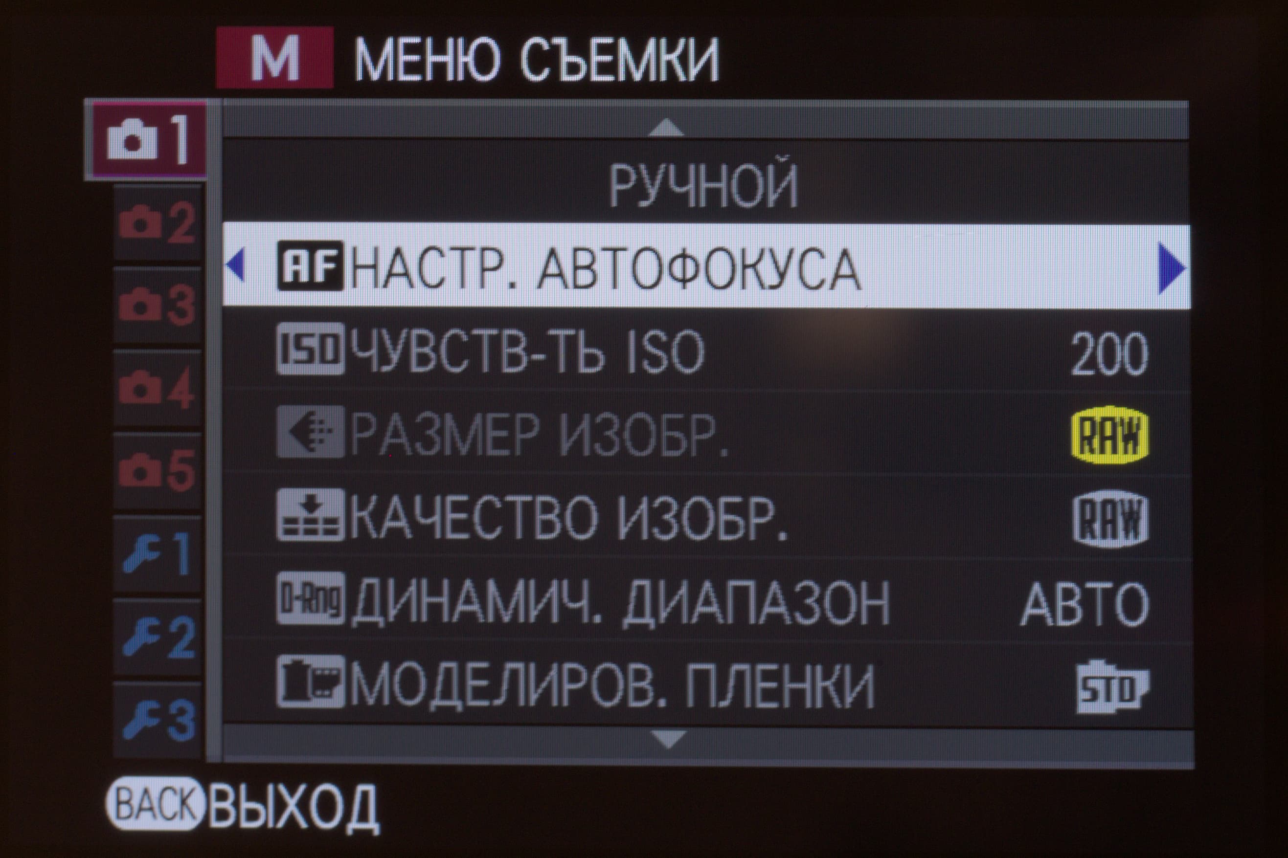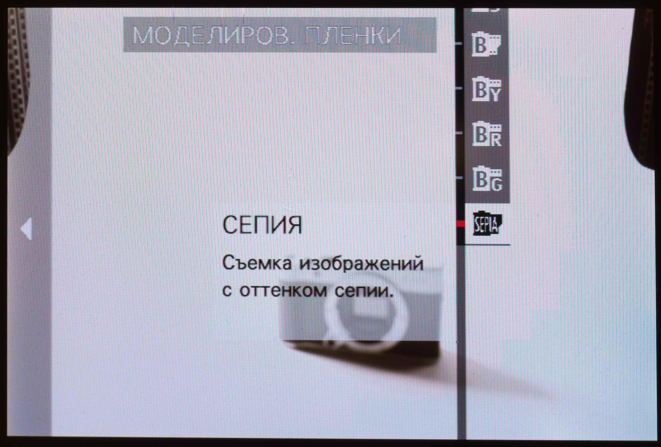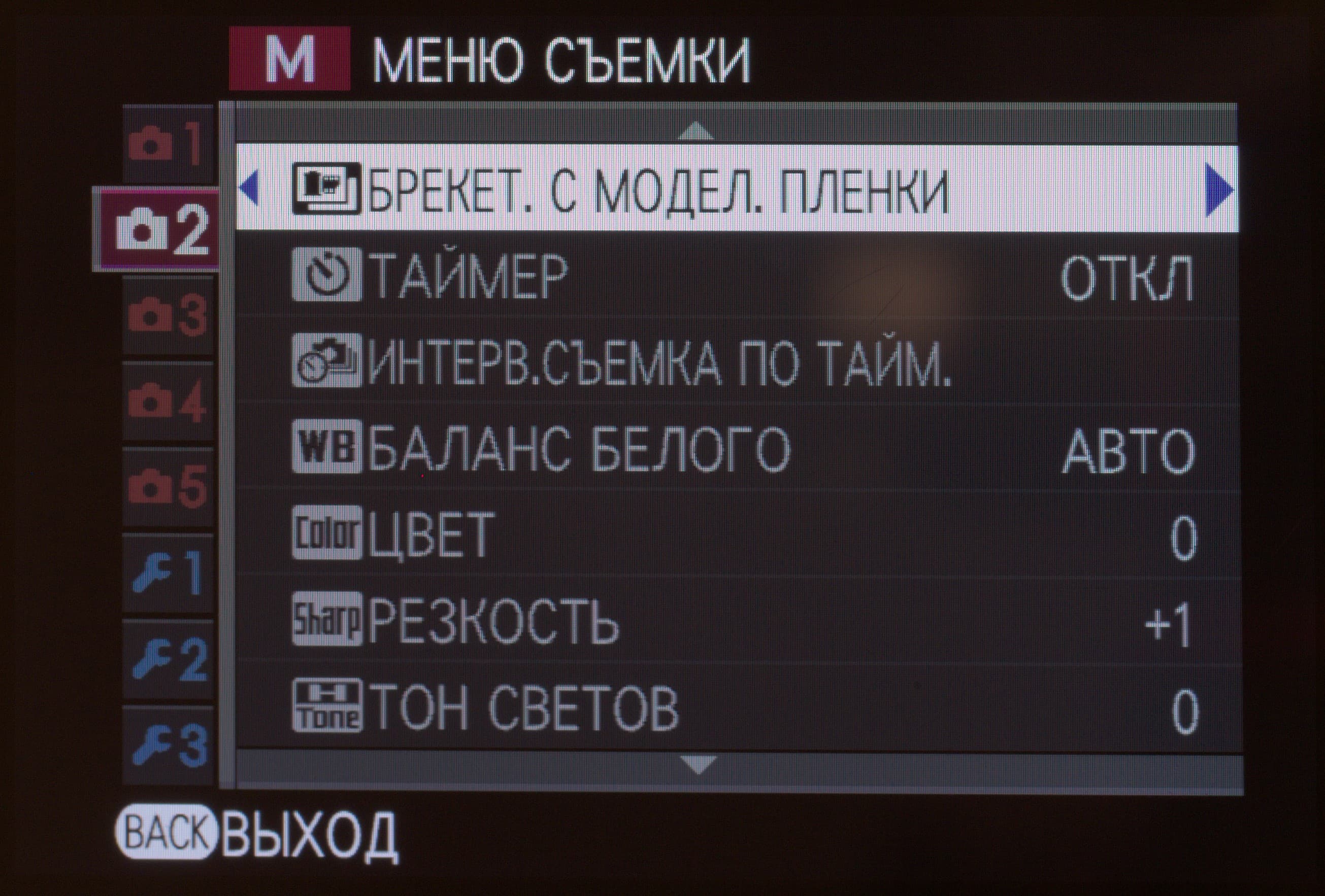 | Режимы моделирования фотопленки Fujifilm | 11 видов: Provia (стандартный), Velvia (усиленный), Astia (мягкий), Classic Chrome, Pro Neg Hi, Pro Neg Std, Monochrome, Monochrome +Ye (с желтым светофильтром), Monochrome+R (с красным светофильтром), Monochrome +G (с зеленым светофильтром), сепия |