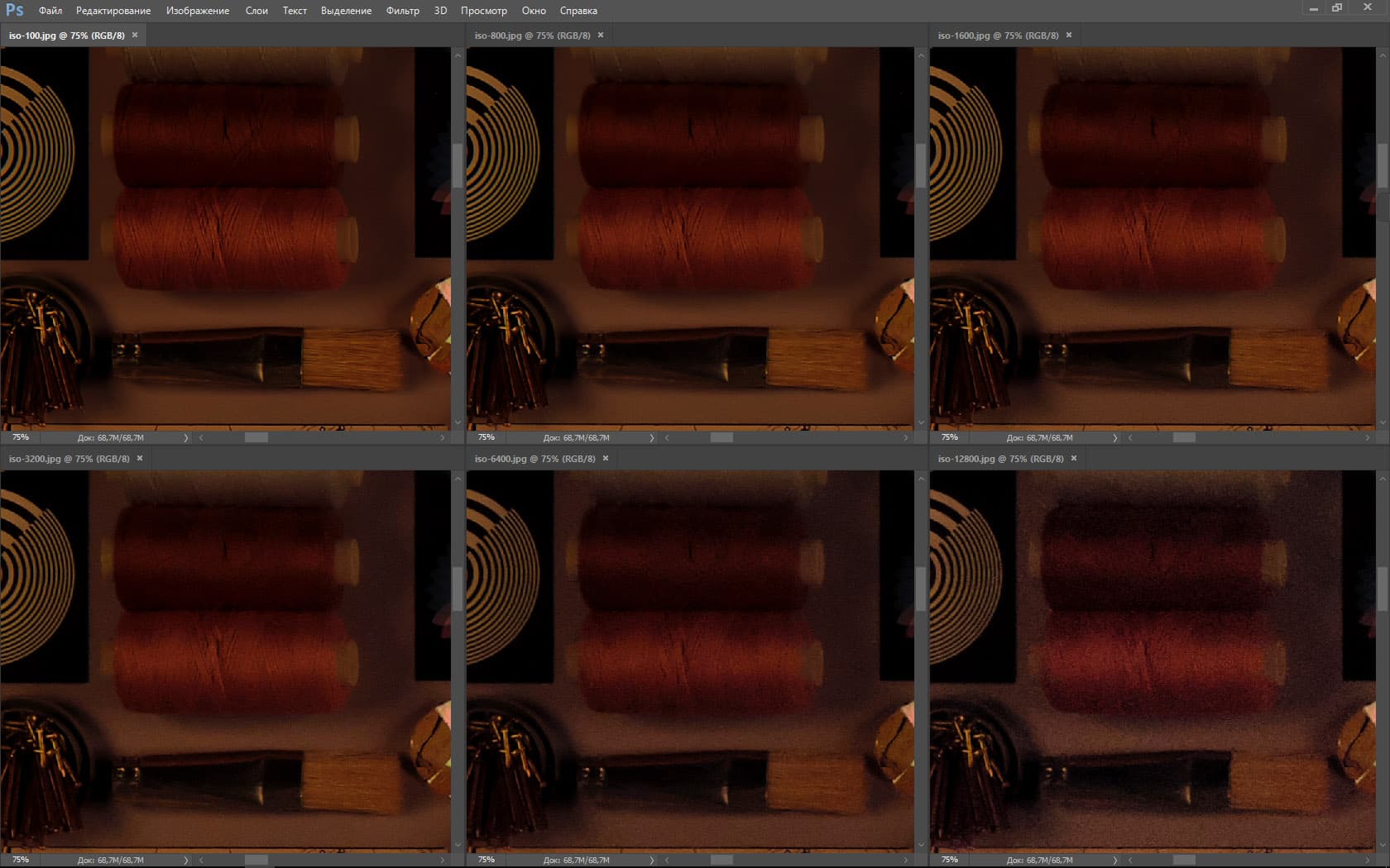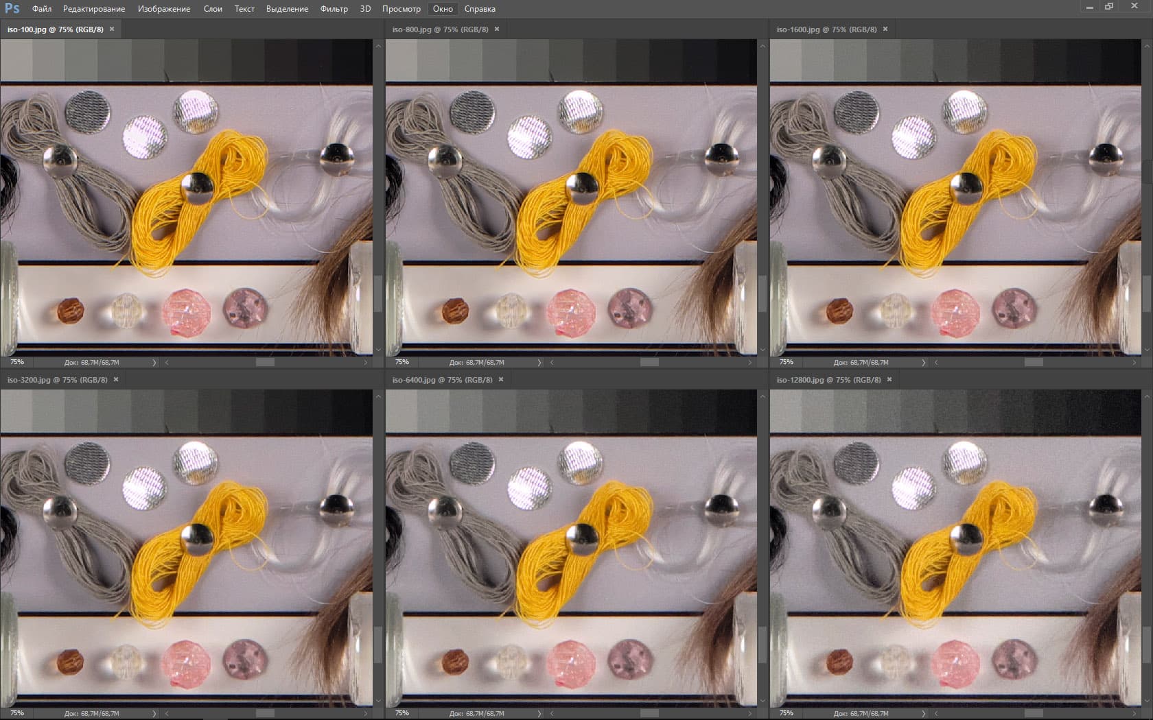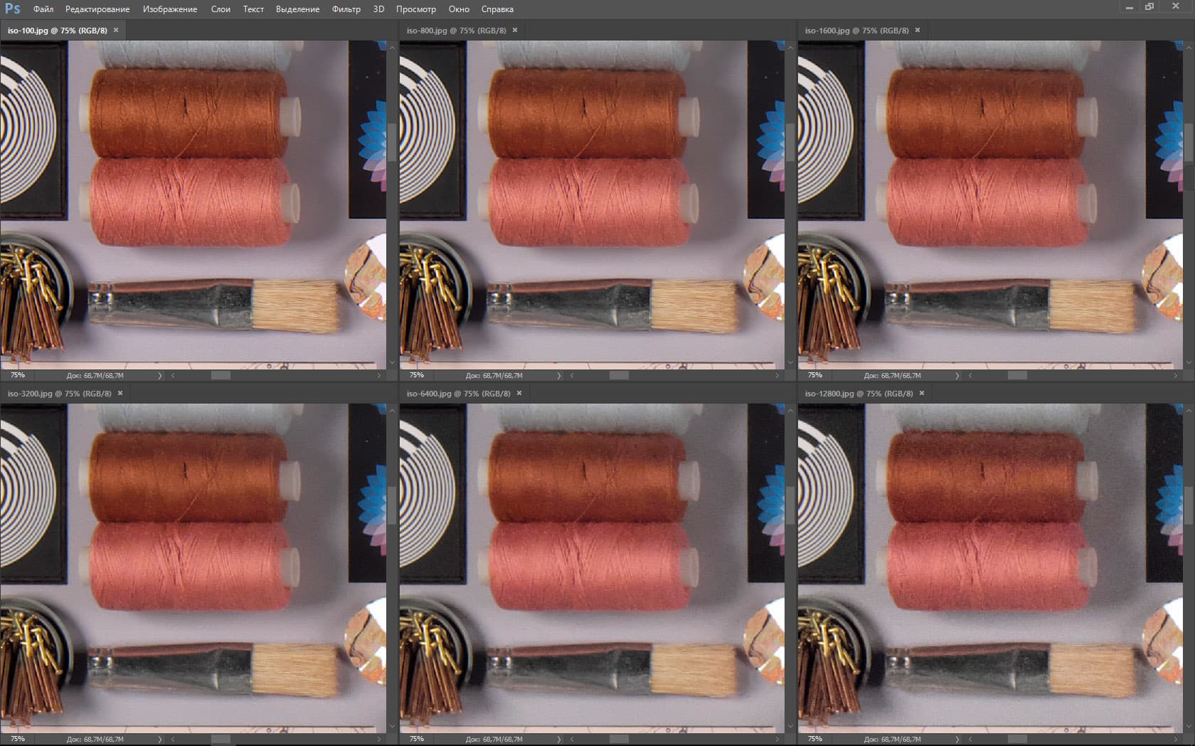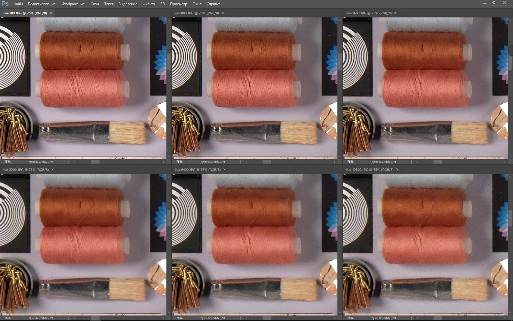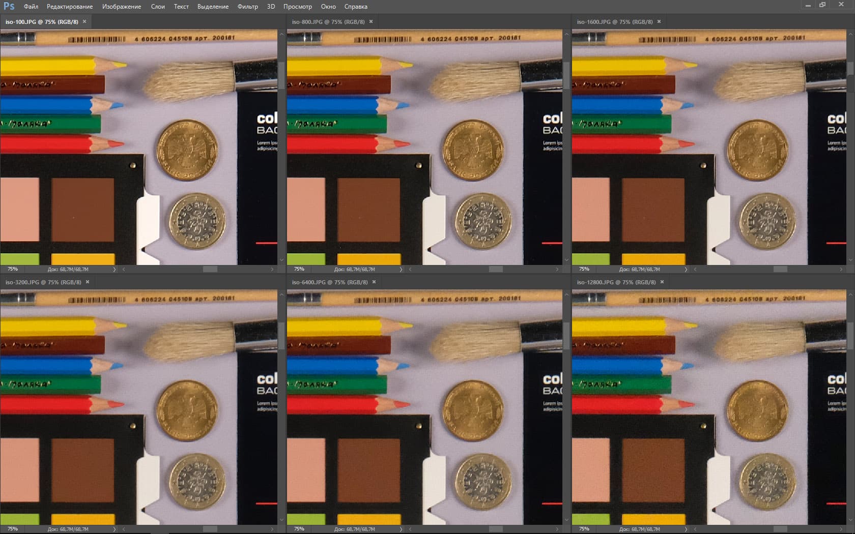 Зато искусственные фактуры беззеркалки Fujifilm обрабатывают очень искусно, выше среднего уровня APS-C. Здесь они действительно приближаются к «полному кадру». Посмотрите, как героиня теста обработала другие фрагменты нашего стенда. Они были сняты в темной и светлой сценах с выключенным и включенным «шумодавом». Всего четыре варианта.